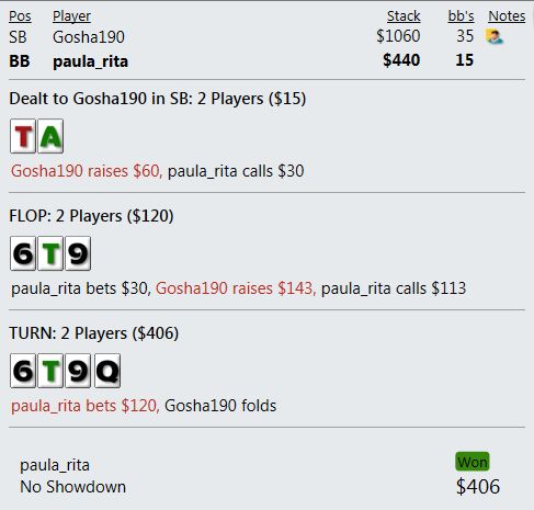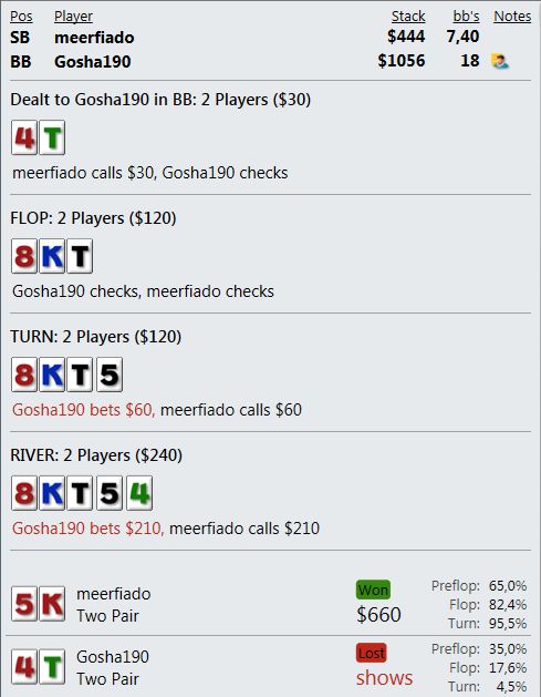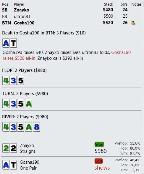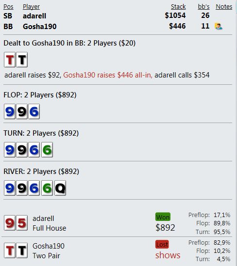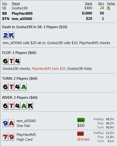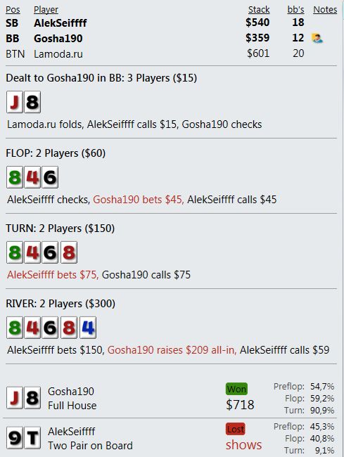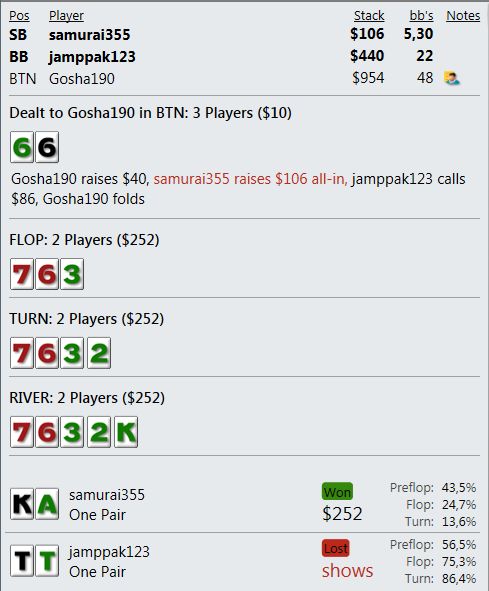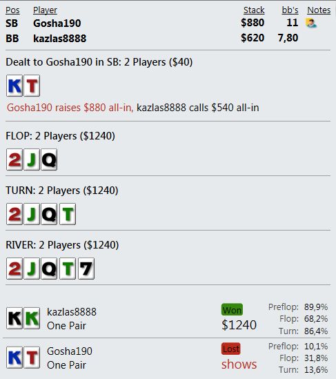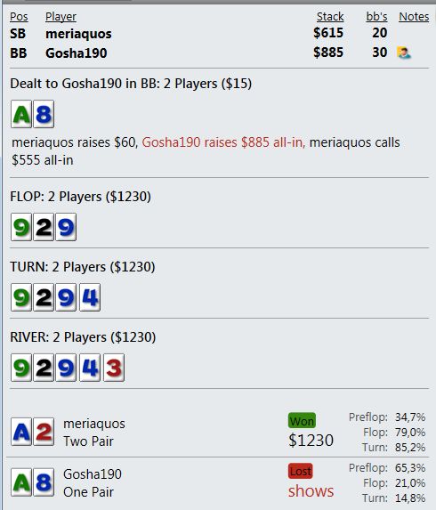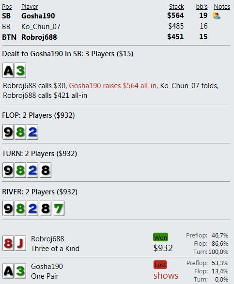 еще один странный на мой взгляд опп - смысл его донка, когда один опп в авто олыне? Кмк - дурость в таком раскладе. Готовой руки не имеет и повышает шанс оставить третьего оппа в игре. Сайд пота нет - за что борется? Дурачок? Или я просто не понимаю глубины мува?