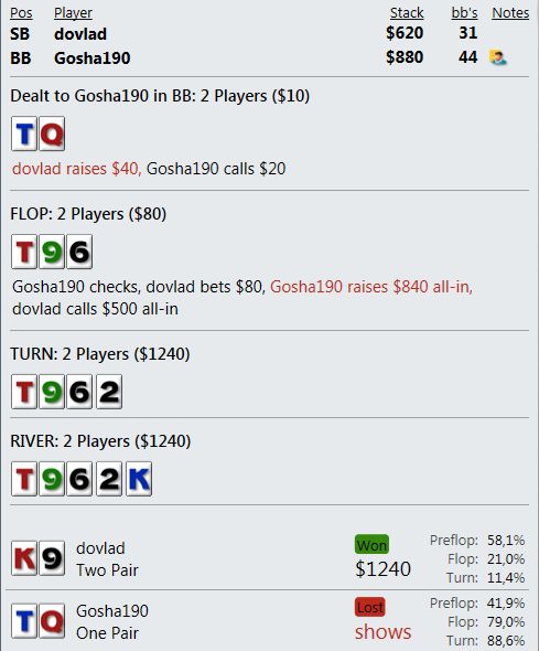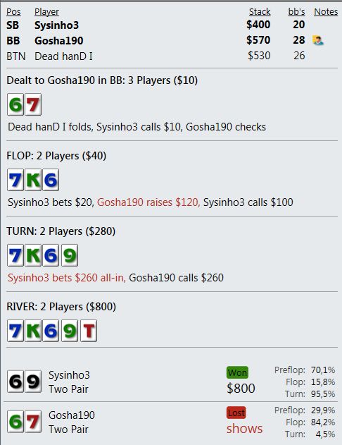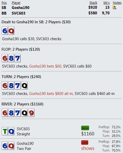 когда тебя весь месяц во все щели, то трудно сохранять игру - тут ХЗ был колл или нет. На ББ сидит нитовый финик (ага - опять!!!) и я четко положил его она каманку старше моей. Вот колить тут на сет или нет.. Учитывая, что он пассивен и возможно послоуплеит еще до ривера... Я выкинул - вроде все верно сделал, но, как я и говорил уже - в борды я попадаю только сброшенными картами - вот очерендной пример.