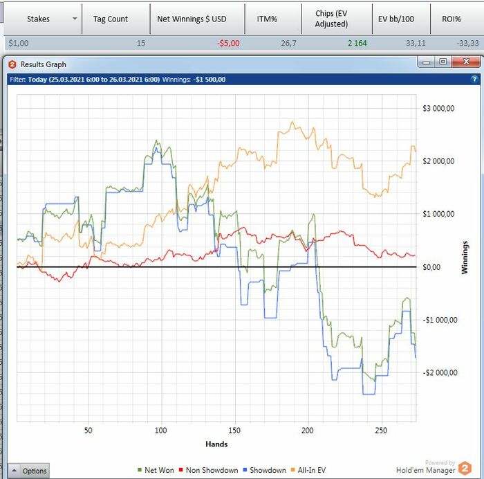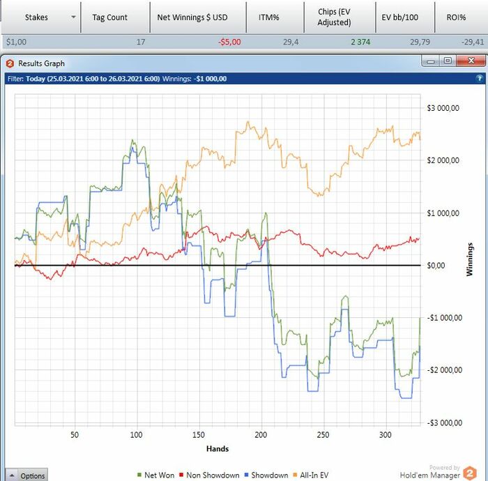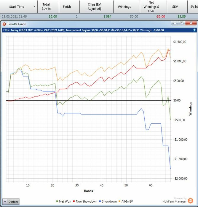 пока ничего не меняется - сдают исключительно в одну сторону и не в мою. Вот первые 4 турнира сегодня и опять все слито под чистую. Вчера слил 16 из 20 - дальше нервы кончились.