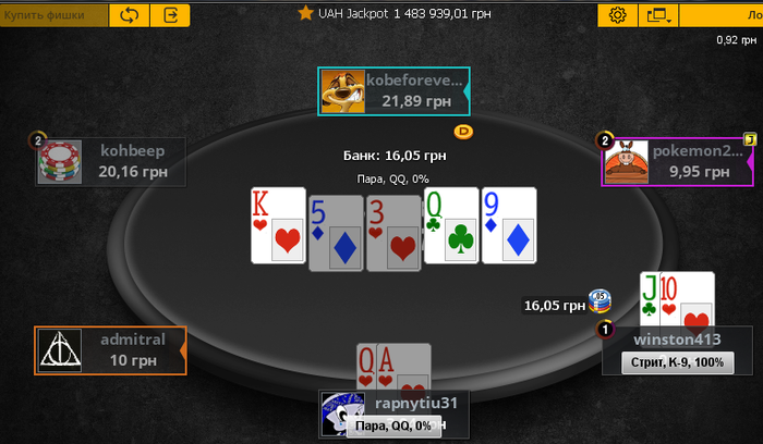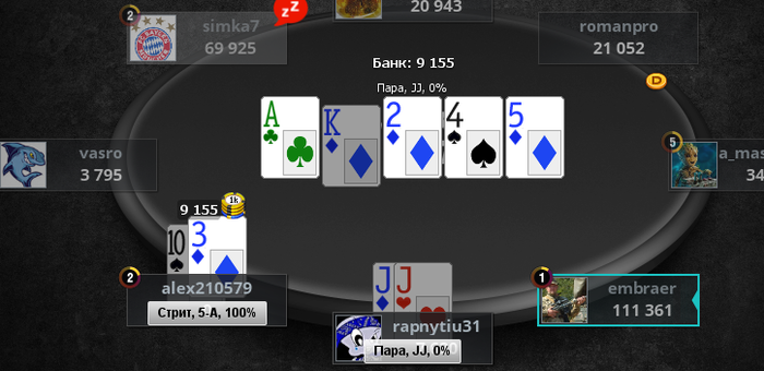 moron09, Вообще тяжело в + выводить!На 2-5 лимите два чела в плюс катают,у меня АА в КК 300-500 бб забират в день,КК в АА еще минус 500-700 бб,на дровах много уходит и против дров еще больше!Много раздач в 4 %!Попадаются персонажи- я 3 бет до флопа там кол,по флопу донк банк я пушь,там изи кол!Так что профит до 5 % а 95 % это плюшки!В сатах не выгодно ребаи делать!