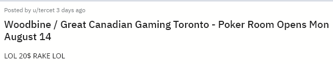 Мда, казино в Торонто выступило в своем стиле — рейк на всех лимитах в открывшемся покер-руме 10% с кепом $20.