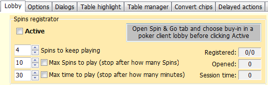 Регистратор для Spin & Go. Позволяет задавать количество играемых столов, количество турниров в сессии и/или длительность сессии. Отображает количество уже зарегистрированных турниров, количество открытых, длительность сессии. Перед началом сессии откройте вкладку Spin & Go в покер клиенте и выберите там лимит, после чего включите Active.