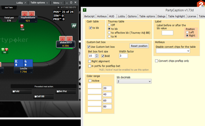 Добрый день Подскажите, пожалуйста, работает ли Party Caption для Омахи ? Имею ввиду вывод различной информации на стол с помощью HUD’a: шансы банка, размеры стеков в больших блайнах и т.п. Заранее спасибо )