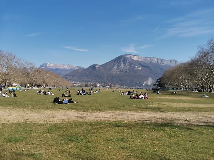 В парке неподалеку народ просто тусит на полянке, наслаждаясь горами и хорошей погодой.