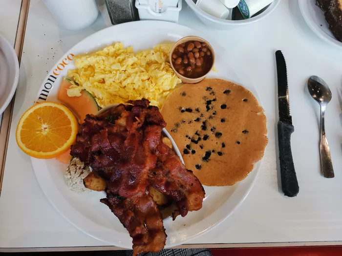 В Европе и РФ я не встречал таких, но в наших краях довольно популярны рестораны, которые специализируются только на завтраках. Отличие от более привычных для постсоветского пространства заведений - меню, которое целиком состоит из различных омлетов, блинов / вафель, кучи видов яичниц и блюд из разряда "куча всего на тарелке" в различных вариациях (как на фото ниже). Выделяются они еще и графиком работы - открываются в районе 6 утра, а закрываются около 2-3 часа дня. Причем, даже ранним утром есть посетители, подобный формат пользуется спросом. Недалеко от нашего дома есть целых 3 подобных заведения.