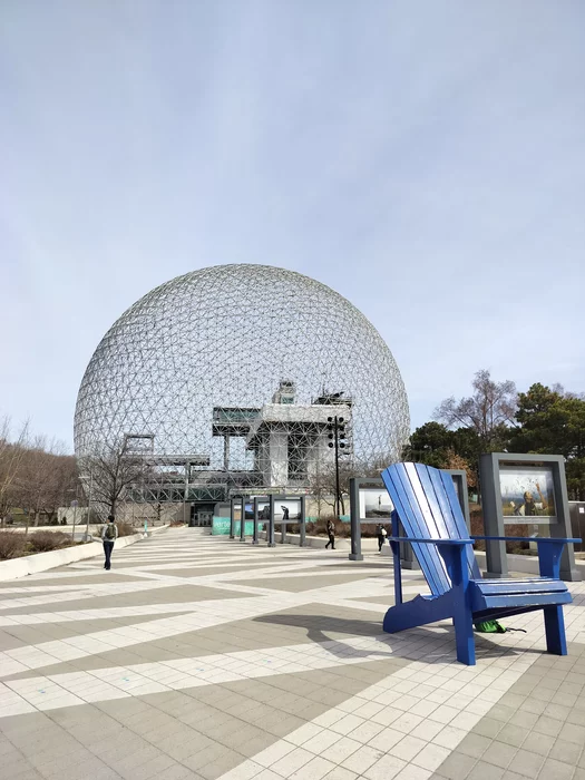 Мы отвели дочек в садик и отправились завтракать. Во время еды решили погулять по центру, но в этот раз посетить места, которые раньше по каким-то причинам обходили стороной. Стартовой точкой для маршрута выбрали Остров Святой Елены. Это небольшой остров, расположенный между Монреалем и соседним городом-сателлитом под названием Лонгей. Сам остров состоит из двух парков - обычного и парка аттракционов. Из достопримечательностей - там находится вот такое здание, музей под названием Биосфера.