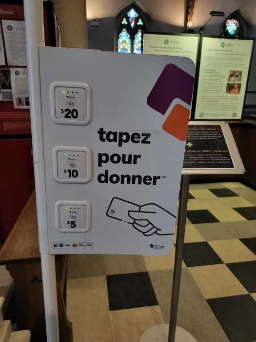 Конечно же, кэш в конверте - далеко не единственный способ задонатить. Как и в любом нормальном бизнесе, расставание клиента с деньгами должно быть максимально быстрым и удобным для него. Церковь в этом аспекте не отстает - есть и QR-коды для оплаты онлайн, а для самых ленивых - панели с фиксированными суммами: нужно просто приложить карту или телефон.