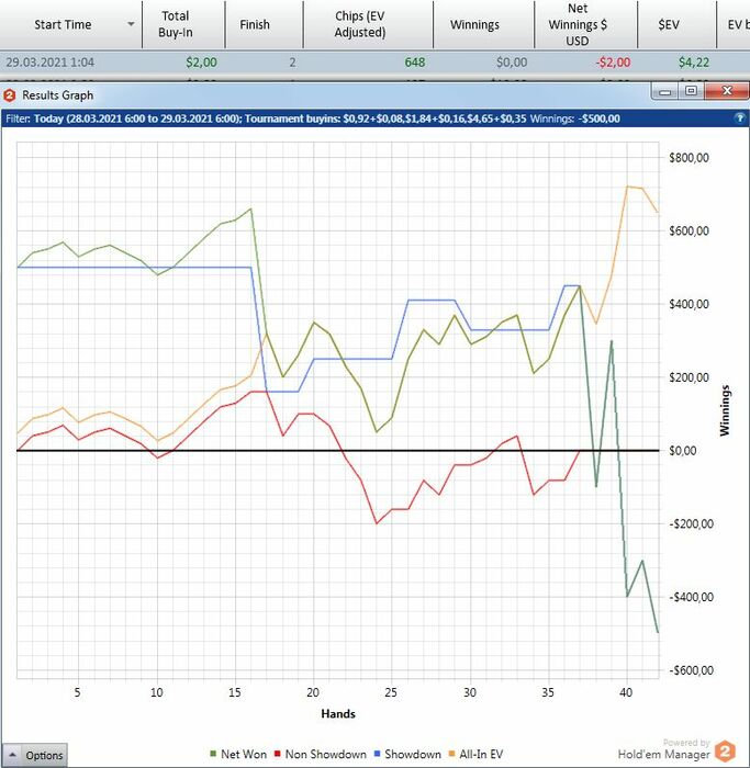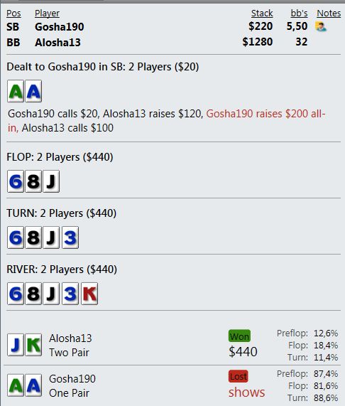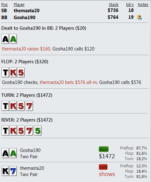 График стремный. У меня синяя ВСЕГДА в РАЗЫ выше красной!!! А тут просто не давали выиграть с более сильными руками или сдавали кулера - отсюда и синяя в нуле и ЕВ низкий. Много раз запихивался с нулем эквити как в примере постом выше. А красная задралась, т.к. мои руки оппы не проплачивали полностью - выигрывал без ШД. Почему-то именно я выставлялся с руками хуже, а мои натсы уходили в воздух. С примерами просто - сегодня три раза разыграл АА. ОДна рука постом выше. А вот вторая.