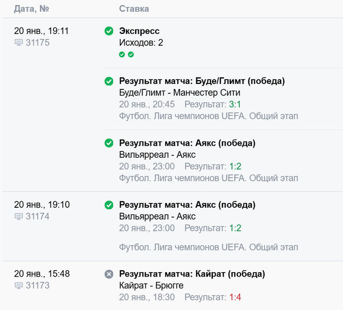 На Аякс вчера давал от 30 до 45% кэф за восьмёрку, ещё и Боде выиграли у горожан, с 55 баксов 3200$, на Fяксе 2200$ с 270