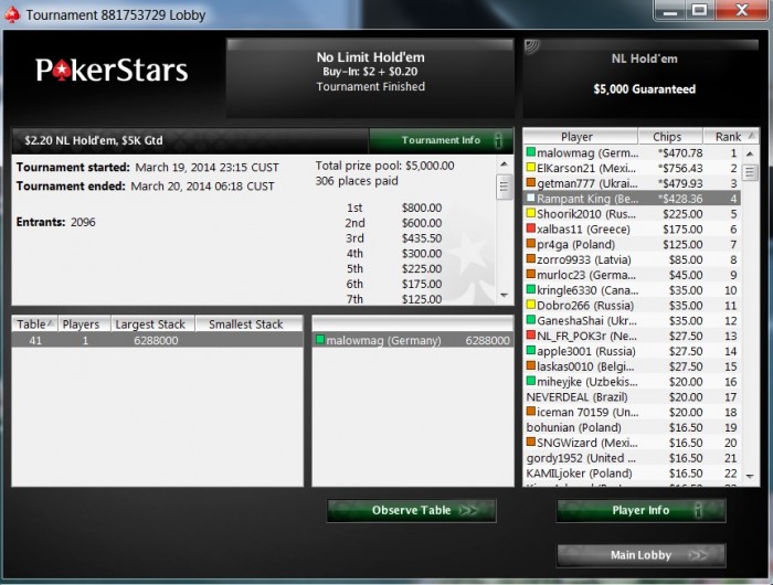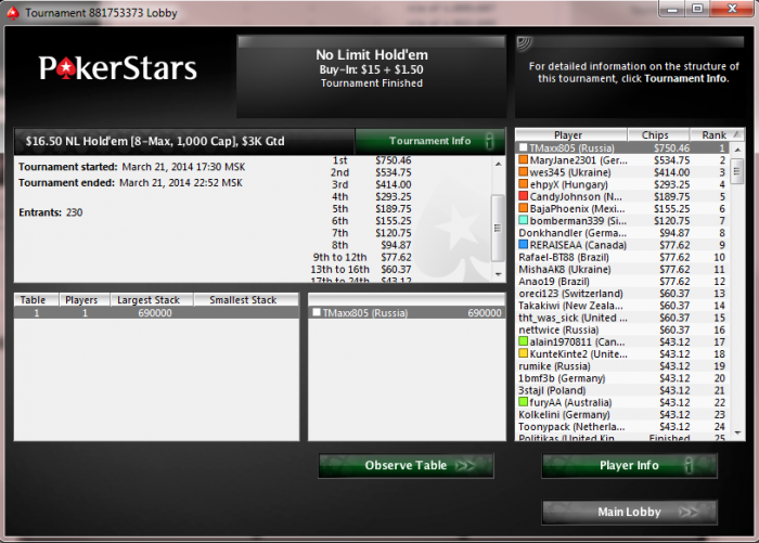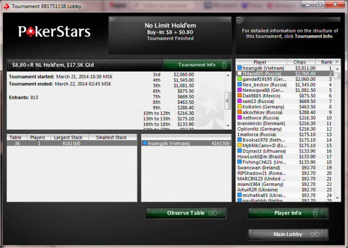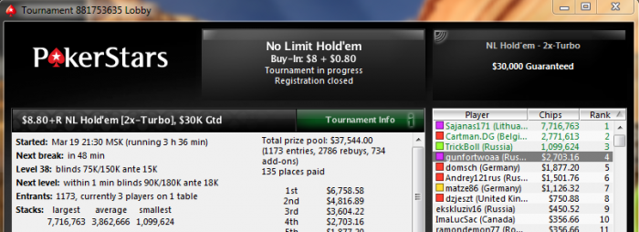 Аааааа НУ НАКОНЕЦ ТООО!!! Непередоваемое чувство, что вооот жеее!!! Столько времени в мтт лудоманил и старзы сжалились надо мной))) В ХА было 1.2млн фишек, еще и сделку сделал, красава вообщем))) Всем удачи!!!