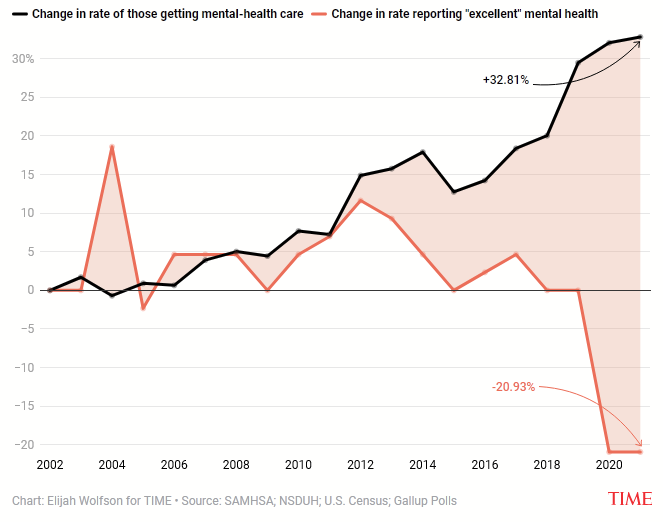Но ладно бы таблы успешно работали - а реальное сравнение динамики людей, которые обращаются за помощью в области психического здоровья (черная линия) и считают себя полностью здоровыми (красная), за последние 20 лет выглядит так: