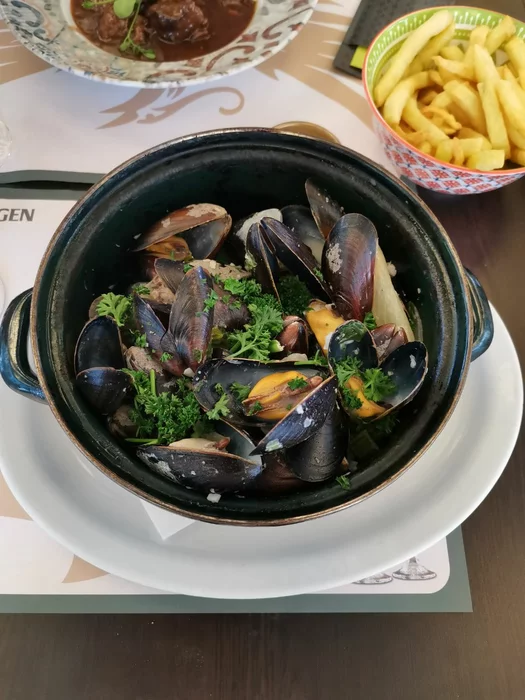 Блюдо дня - мидии. Во многих ресторанах подают кастрюльки с этими моллюсками, у туристов они популярны. Почему-то в этом рестике они шли вместе с картошкой фри.