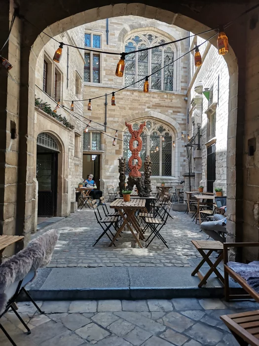 Внутри миниатюрный дворик, в котором располагается бар (какое еще заведение может быть в Бельгии?). Лампочки сделаны из пустых пивных бутылок. На входе посетителям предлагают убрать телефоны и общаться друг с другом, как будто на дворе 1969 год.