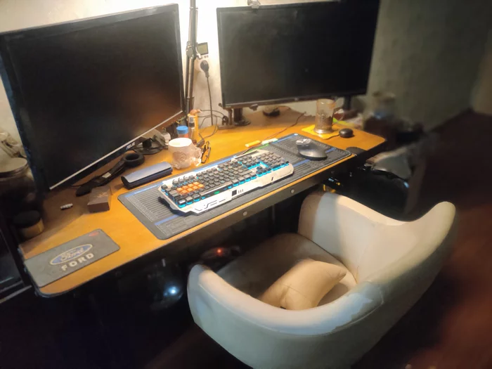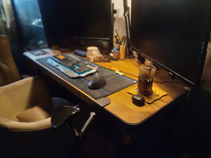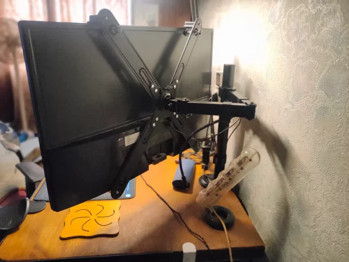 Тоже на кронштейны перешел. Второй монитор, справа через адаптер крепление, потому что не все мониторы имеют крепление под кронштейн. Но кронштейны другие выбрал, вертикального крепления, показалось эти понадежнее