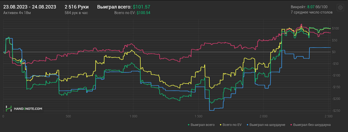 24/08/2023: 4.18ч, 2516 рук nl50 +$87.