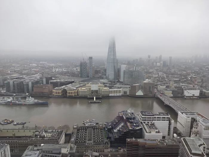 С другой стороны виден небоскреб "Осколок" или The Shard - самое высокое здание Великобритании и всей западной Европы. Прямо у его подножья один из многочисленных лондонских вокзалов с нехитрым названием London Bridge в честь близлежащего моста. Наконец, на набережной пришвартован HMS Belfast - местная Аврора. Тоже крейсер, который превратили в музей.