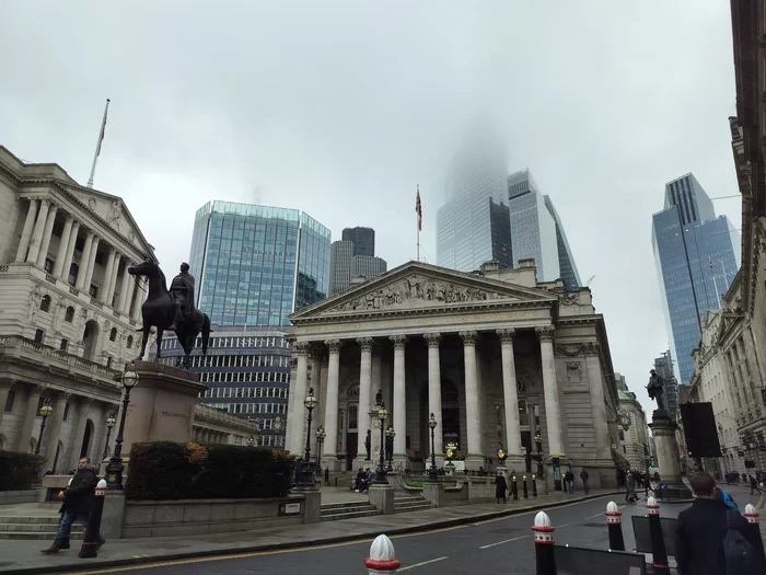 На выходе из метро здание лондонской биржи. Когда-то оно использовалось по назначению, но в конце прошлого века было преобразовано в торговый центр. На заднем плане - высотка, уходящая в серые облака - как раз нужный нам небоскреб, где нас ждала смотровая площадка под названием Horizon 22.