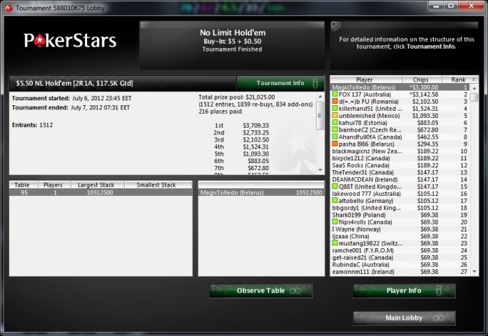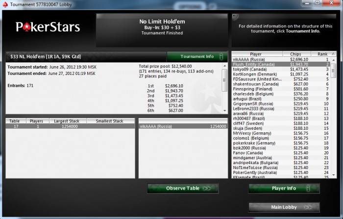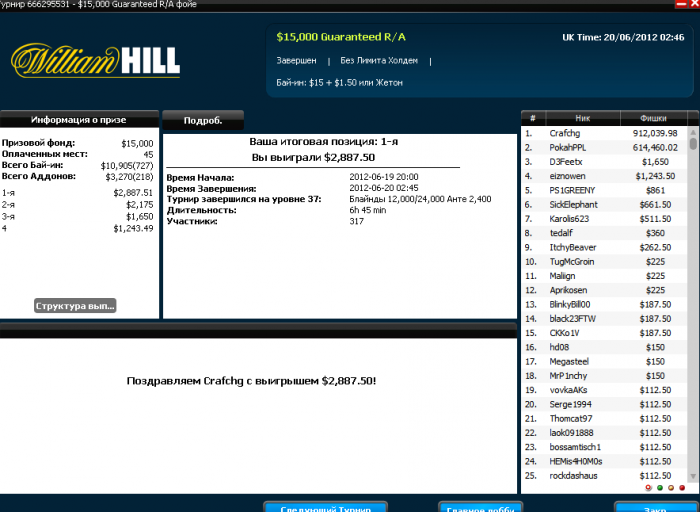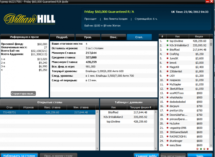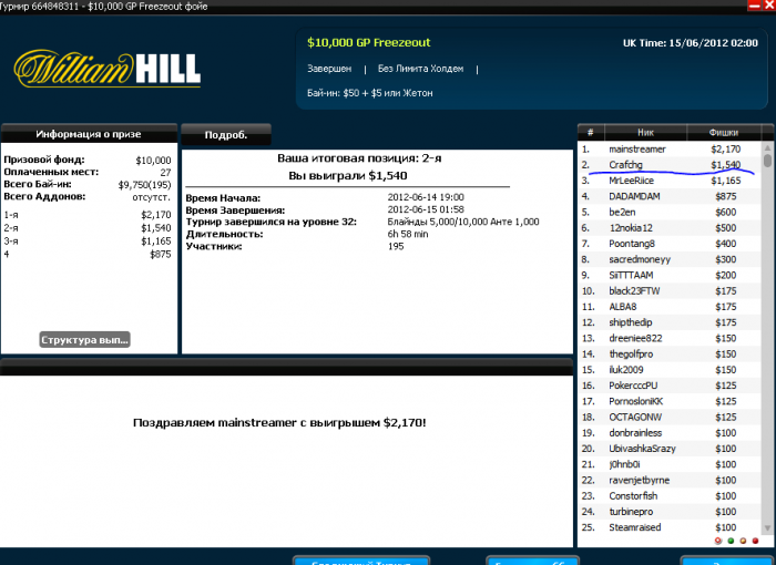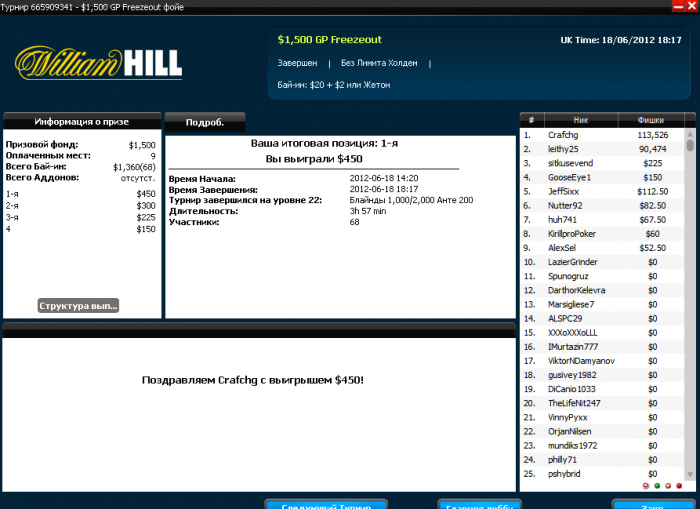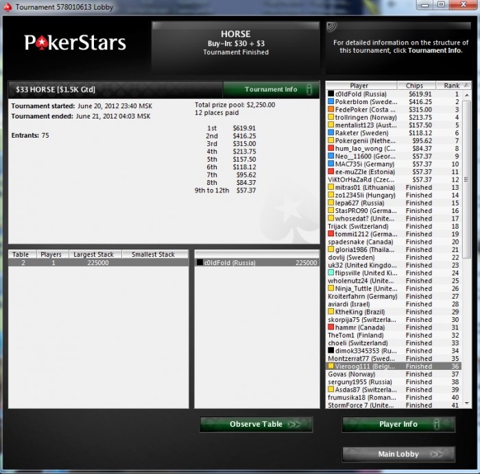 После неудачи на Weekly HORSE хотя бы слабое утешение)) На 4х поделили, т.к. у всех было очень мало бигбетов) Но оставленную сотку для первого места все таки отобрал у них))