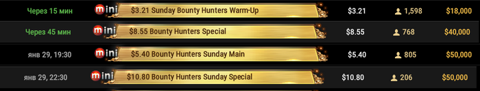 Siniga @ 29.01.23ПокерОК, была же нормальная серия Bounty Hunters осенью, когда за ~$5 был каждый день (!) турнир с гарантией $30 000, ну и очевидно по каждому следующему бай-ину за $8, $10 и так далее - был один супер-вкусный ежедневный турнир с ещё большими гарантиями, не говоря уже про воскресные версии этих же турниров с ещё более умопомрачительными гарантиями, и никаких тебе "стейджей" - сел и катаешь за 1 заход. Я надеюсь эту серию, но может под другим названием, ПокерОК повторит в ближайшее время.
