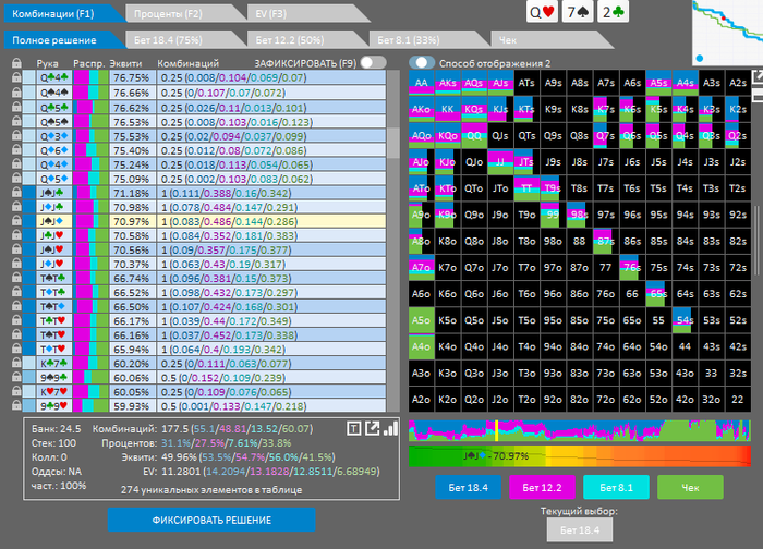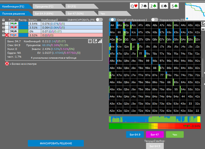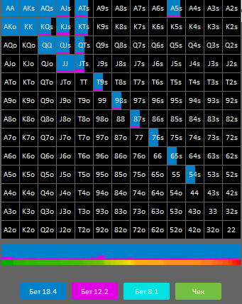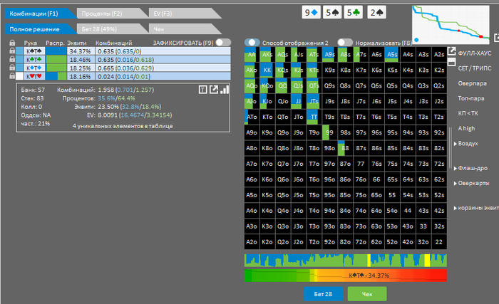 Интересно, что с нашей рукой есть рейзы на флопе. Не уверен , что так кто то сыграет. Я подумывал над тем ,что бы переставить, но не стал потому ,что совершенно не знаю ,как играть на ответную агрессию и что делать на любом терне в случае колла.