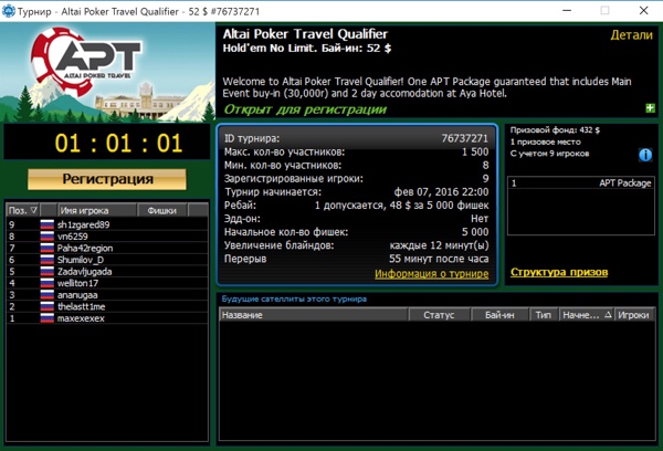 За час до старта заключительного отборочного турнира - LotosPoker APT Qualifier пройден "прожиточный минимум". Так что как минимум еще один билет в главный турнир серии будет разыгран. Пока в стартовом листе 9 игроков, в том числе и хорошо известных нам - "maxexexex", "thelastt1me", "ananugaa", Антон "welliton17" Дюков, Александр "Zadavljugada" Сажинов, Даниил "Shumilov_D" Шумилов, Павел "Pasha42region" Кириенко, "vn6259" и "sh1zgared89". И пусть победит сильнейший!