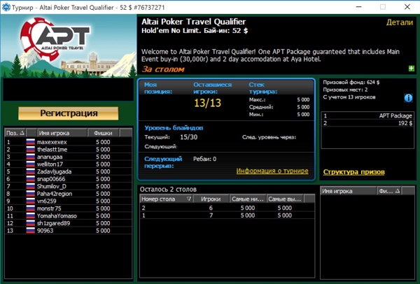 Не за что ;) LotosPoker APT Qualifier начался. В последний момент добавилось еще несколько игроков, и в итоге - 13 участников. Возможен 1 ребай ;)