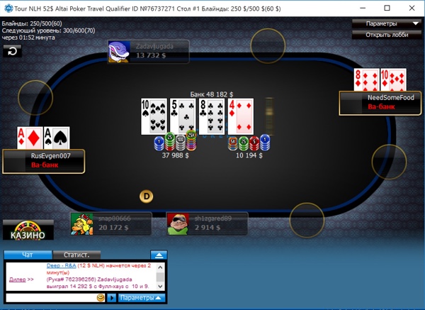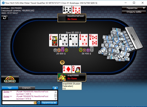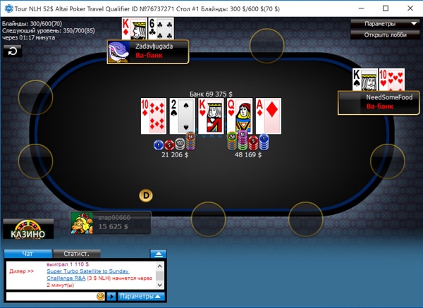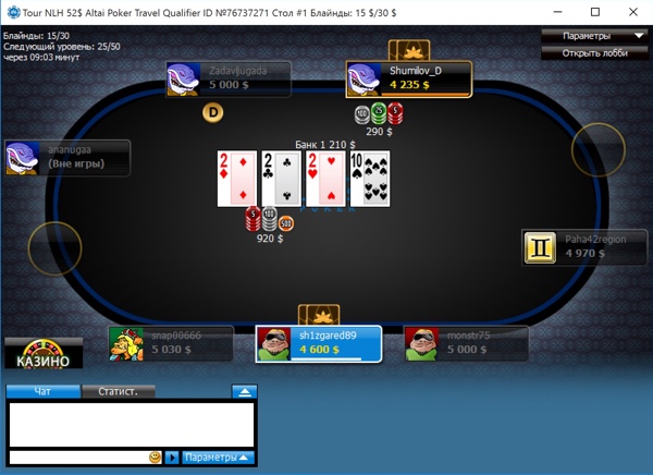 Дилер новосибирцу не помог. Аут. Вскоре за ним последовал и экс-чиплидер "sh1zgared89": удвоился о "Zadavljugada" ( > ), но тут же отдал соседу слева. "Snap00666" в который раз поймал его на доминации, заставив пустить в ход все фишки на доске . Его кикер - оказался посильнее.