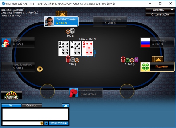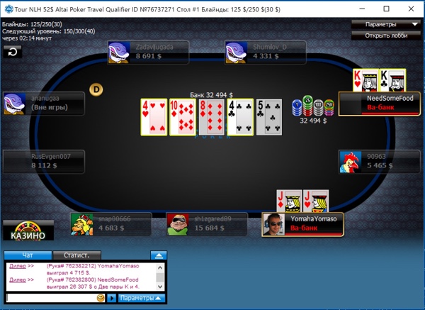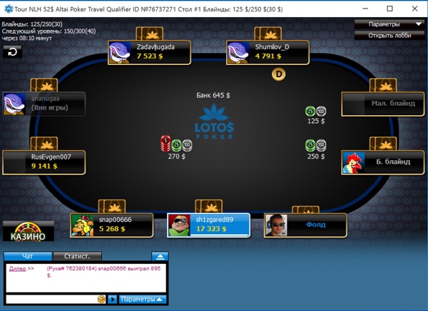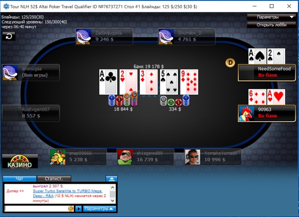 Чиплидером за него сел "sh1zgared89", но несмотря ни на большой стек, ни на выгодную позицию активности совершенно не проявлял. Пришлось взять вожжи в свои руки другим. В первую очередь Игорю "NeedSomeFood" Явленину. Иркутянин при любом раскладе приезжает на Алтай на всю серию, но буквально перед самолетом он решил испытать шанс взять путевку на мэйн в любимом LotosPoker. Через этот рум Игорь уже неоднократно отбирался на различные живые серии.