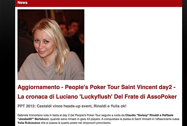 ...В 2012-м Италия с замиранием сердца следила за тем как русская красавица Юлия Рукосуева билась за первый приз в People's Poker Tour в Сент-Винсенте.
