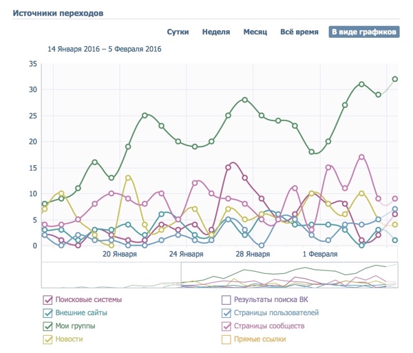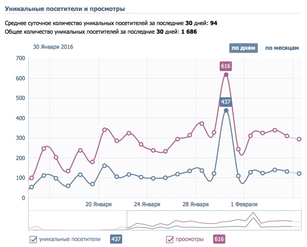 Как часто нас смотрят? Из 225 членов группы почти половина из них каждый день заходит на страничку, делая как минимум три клика внутри общества. Общее число "уникумов" за такой короткий промежуток тоже довольно высоко. Можно сделать вывод, что посетителям группы реально интересно и полезно ее содержание.