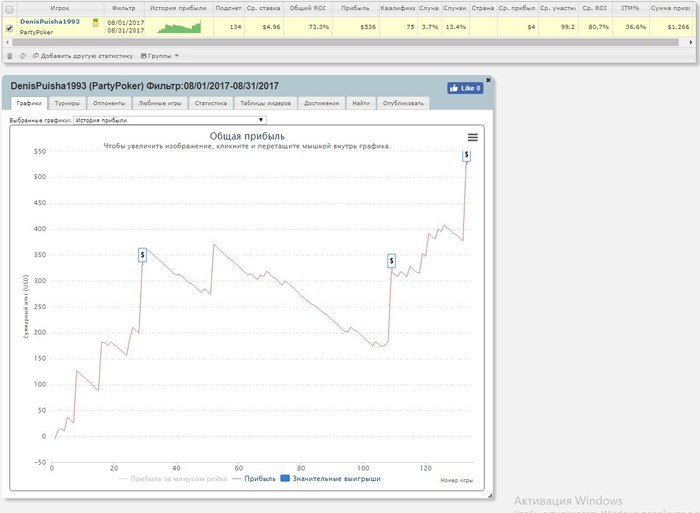 Ну что же месяц закончился можно сказать, самое время подвести итоги: 1) Месяц выдался самым размазанным за последние месяца 3-4, откатал всего около 200 турниров - это безусловно большой минус (пропустил дней 6-7 из-за того что выбирались дважды на природу пока была погода ну и пару дней гости были). 2) Теперь к хорошим новостям, не смотря на то что месяц получился крайне ленивым, на профите это не отобразилось, в итоге вышел на мой взгляд вполне хороший + График Partypoker