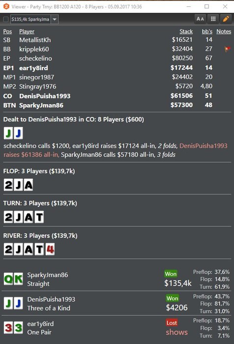 Расскажу о финалке пару слов, точнее об игроке с ником "tieeeeenlong", в общем вышли мы на финалку у него был первый стек примерно 800К у ближайшего где то 500К, в итоге он просидел всю финалку без действий, на 123руки статы вот такие