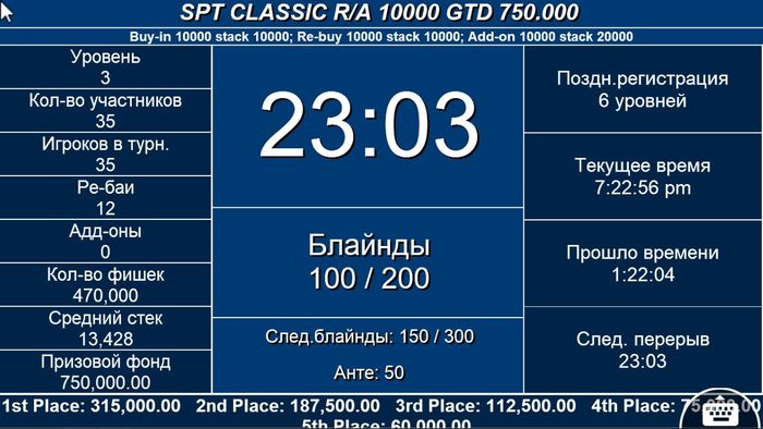 Стол №6 За 30 секунд до перерыва Александр Пригарный пуш 37К на , Василь Гилязетдинов свой алл-ин 180К с , флоп , терн , ривер Саркисов Рафаил выкинул на ББ
