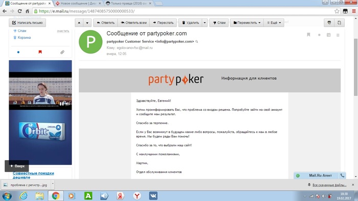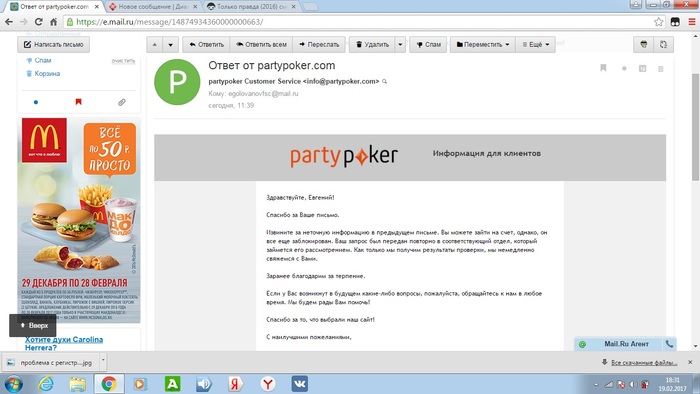 Добрый день! Обращался уже ранее к вам за помощью. Опишу в крации суть дела. Где-то в начале февраля столкнулся с проблемой регистрации в турнирах на PartyPoker, аккаунт верифицирован все документы в норме, при использовании клиента пользовался VPN. При попытке зарегистрироваться появилось вот такое окошко, скрин ниже прикрепил. Написал в саппорт PartyPoker, просили отписаться насчёт своего ip и прикрепить скрины, всё сделал как просили. И кстати решил вопрос входа в клиент без VPN, благодаря одной из тем на Gipsy. Далее двух недельное с небольшим ожидание и вчера получил вот такое письмо, скрин прилагаю, что проблема решена. При попытке зарегистрироваться в турнирах ничего не изменилось. Отписался на саппорт, ответили что проблема действительно не решилась, они занималось якобы другим вопросом, а этот вопрос до сих пор повис и нужно снова ждать. Если поможете буду очень признателен, ведь это единственная возможность на данный момент попытать счастье в сателлитах на Сочи. Клиент скачал только ради этого. Прикрепляю все скрины! p.s. И кстати билет на сателлиты по акции для русских клиентов, так же не пришёл, если он появиться буду очень рад, хотя в данной ситуации это уже второстепенный вопрос.
