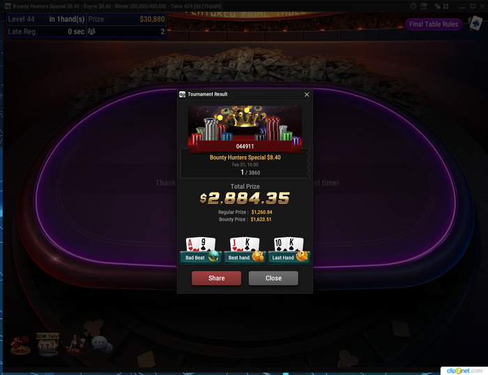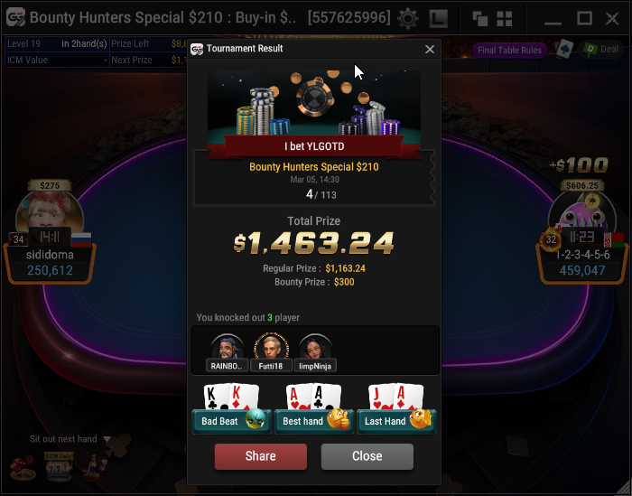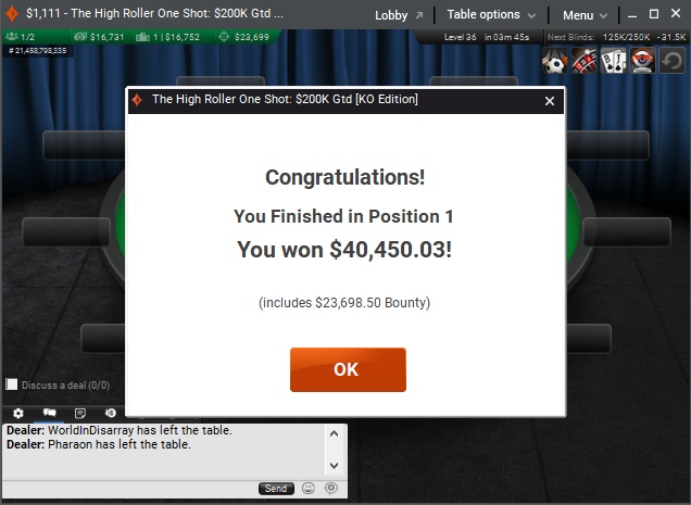 «Всё очень быстро закончилось, чему я очень рад, потому что у меня стоит стек (во втором дне) турнира хайроллеров. Финалка сложилась хорошо, не было сложных раздач. Эмоционально эта победа — хорошее событие, хотя в целом это лишь иголка в стоге сена моего даунстрика»