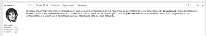 this_moment @ 7.6.2017 Влад, мы никак не оспариваем твое решение , а лишь хотим уточнить важные детали и убрать очевидные противоречия. Мы уважаем твое мнение и также прекрасно понимаем, что дело сильно разрослось и усложнилось. И что естественно, ты мог упустить некоторые важные детали. Поэтому мы хотим иметь возможность задать вопросы касаемо твоего решения и не только в течение суток. Никаких новых требований у нас не появляется в процессе. Мы лишь уточняем твое решение, т.к. оно на наш взгляд совсем неоднозначное и не решает спор, а лишь дает причины продолжить его. Поэтому просим тебя все-таки разобраться в деталях и довести это дело до конца.