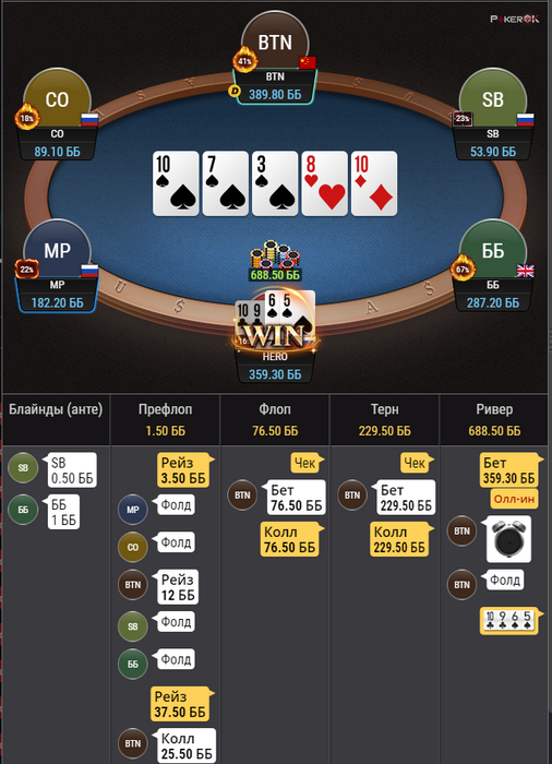 Но камон, это пло10, как я понял, опп сильно фишной, колл оппу стоит как обед в ближайшей закусочной, фиши такое не выкидывают. Да даже, если он додумается подумать, тут сложно фул придумать, 2х пар не должно быть в диапазоне 4бета, большая часть сетов флоп поставит.