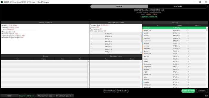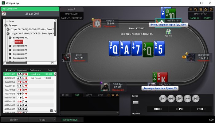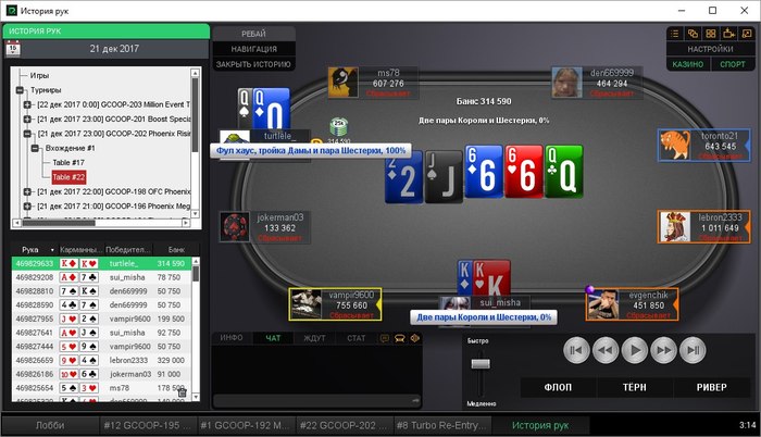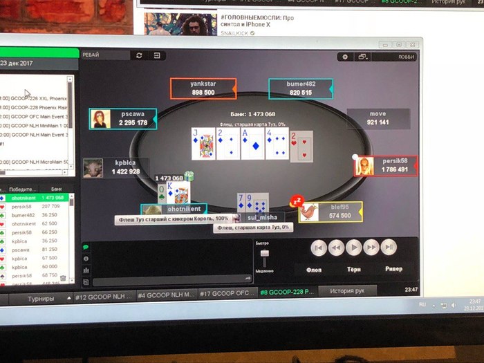 Сегодня была неплохая рыбалка пару турниров сам запорол, несколько раз шатнули снизу ,ну да ладно везде в призах))) 4 финалочки у нас было и есть еще 1 золото в остальных 5,6,8 места, в хедзапе ожидал большего сопротивления конечно от joancarlo1, ничего плохого сказать он нем не хочу, с ним играл оч мало за всё время! Наверно просто человек устал или торопился куда то, хотя преимущество по фишкам было у него в 2 раза больше! Ду маю в след раз даст серьезный бой К сожалению слишком много было турниров у меня и глубоких проходов, а когда освободилось место уже была поздняя рега на 9999 и не хотелось прыгать на 15бб поэтому принял решение лишний раз не вливать 10к, зато будет время отдохнуть и выспаться! Ведь впереди у нас финишная прямая, последний 3 самых важных дня, которые решат исход битвы Догнал немного по очкам в лидерборде ну и переместился на 2 строчку,будем бороться за 1 конечно без вопросов! Всем спасибо кто аурит и болеет!!!!!!!!!
