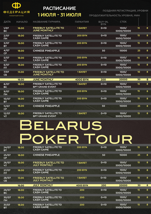 Бай-ин 0+10 BYN Если вы делаете ребай до начала турнира, то получаете стек 10000 фишек Стеки 1500/5000/10000 Уровни 15 минут Поздняя регистрация 8 уровней ГАРАНТИЯ 2 СТЕКА ПО 50$