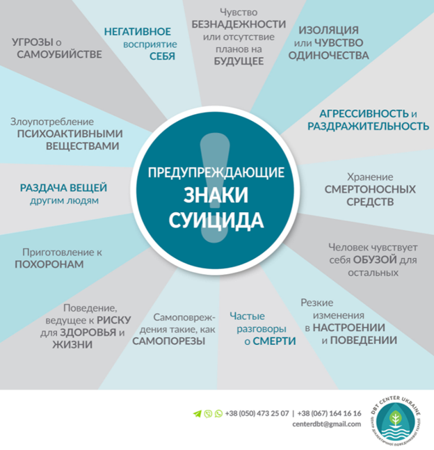 Украинский центр Диалектической поведенческой терапии выпустил отличный ряд инфографик о тебе превенции и правильного реагирования, когда кто-то из ваших близких говорит о теме суицида. Вы можете найти их аккаунты в инстаграмм и фейсбук.