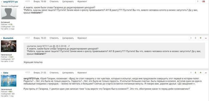 Оказывается реально есть люди, которые прям "РУКИ ПРОЧЬ ОТ ГАГАРИНА!" Тогда уж, руки прочь от Телеграфного агентства Советского Союза, потому как именно ТАСС поставил в известность людей, про то что Юрия Алексеевича успешно прокатили в космос из которого он вернулся на парашюте, ну хорошо ебать что хотя бы не на зонтике. Больше фактов нет, только всякие в разной степени нагруженные эмоциями домыслы.