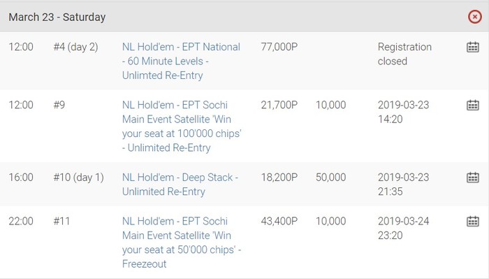 EPT SOCHI 20-29 MARCH 2019 Entries: 61 Date: 22/03/2019 Event #: 8 Event Name: SATELLITE TO EPT MAIN EVENT SEAT AT 50K CHIPS Buy In: 610