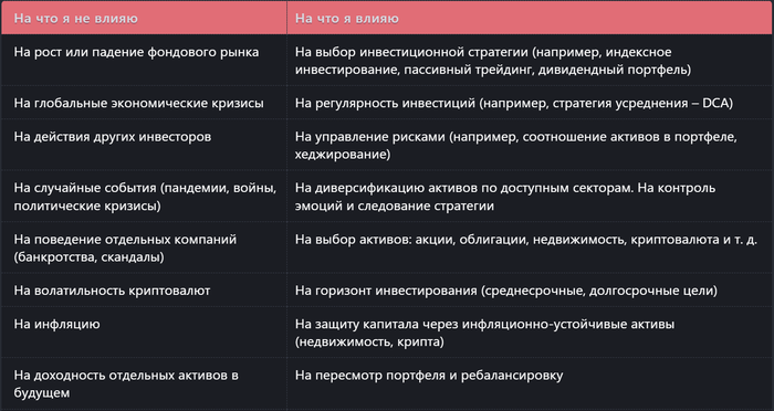 Вот тут как раз и помогают практики стоицизма. Когда-то давно я составил таблицу, где подробно расписал все триггеры, которые могут вывести меня из равновесия. В ней всего две колонки: "На что я не влияю" и "На что я влияю". На снимке представлена финансовая сфера, аналогичные таблицы я сделал для всех сфер жизни. Можно сделать и распечатать, что бы держать рядом, например у рабочего стола. Это будет напоминать о том, где держать фокус, что бы не погрузиться в негатив.