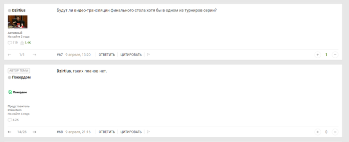 Хотел пару слов вставить по поводу разговоров о том, что Реги выигрывают много проходок. По поводу ограничения проходок ЭТО ПОЛНЫЙ БРЕД!!! Люди играют за свои деньги. В Сочи езду с прошлого года с июля на все серии, вот случай: есть там один человек который играет во всех сателлитах и просто колечит людей, меня лично четыре раза в три аута переехал в поздних стадиях сата до билетов 3 человека и при этом не дошёл до билетов. Ему это как будто и не нужно. Играет на любых двух картах, вне зависимости от ставок, трибэтов, олинов. И ЧТО?! Давайте теперь фильтровать и ТАКИХ ИГРОКОВ?!???? Не довать им играть потому что они ПРОСТО ПОЛУЧАЮТ НАСЛАЖДЕНИЮ ОТ ВЫБИВАНИЯ ЛЮДЕЙ???!!!