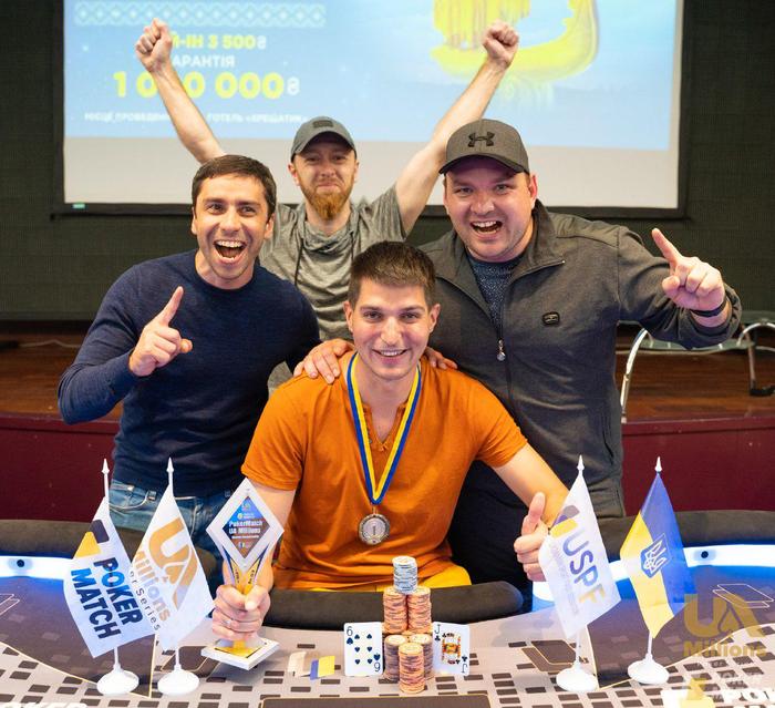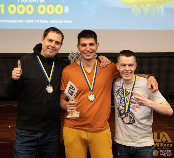 Тройка призеров чемпионата Украины по спортивному покеру: 1 место. Денис Панченко (Киев) 2 место. Даниил Ермолаев (Днепр) 3 место. Дмитрий Кравченко (Киев)