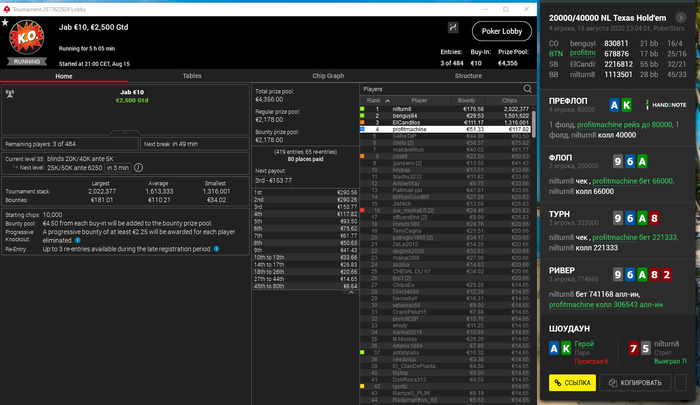 Апстрик подвезли, как и обещал))) Пацаны это нечто, ГГ покерок опять начал виснуть, турниры скипались из-за того, что онлайн на серваке 120к людей, явно сеть к такому наплыву не готова, вечером на это количество тел остался турнир Turbo 10$, где гарантия была 2500$, т.е рассчитан на 250 человек примерно, ну из-за технических траблов и наличия одной турбины получилось собрать 8100$, с 900 энтри.