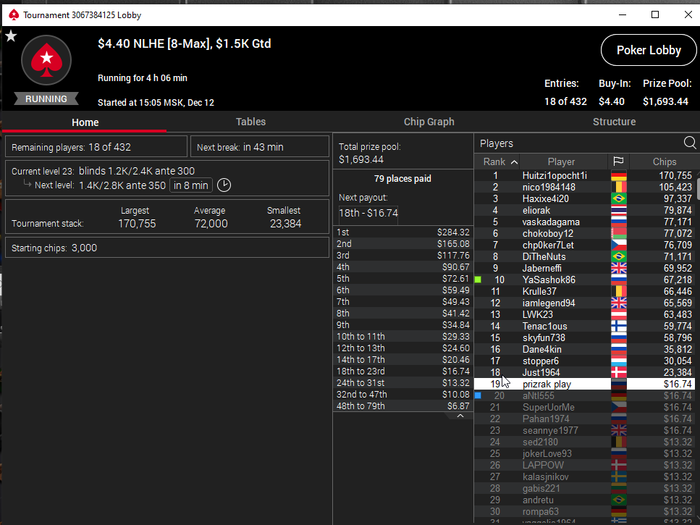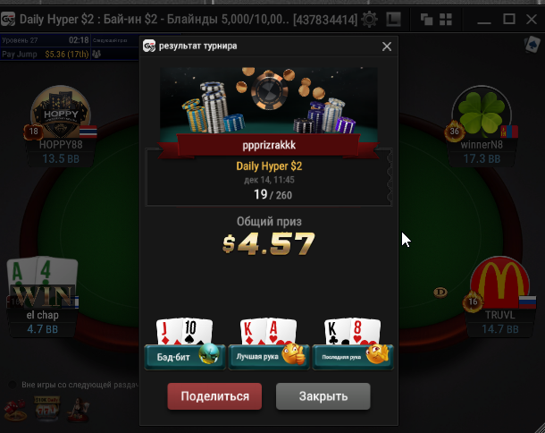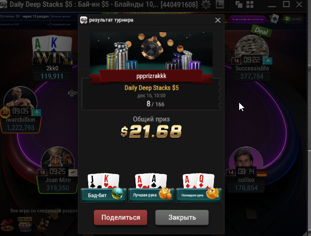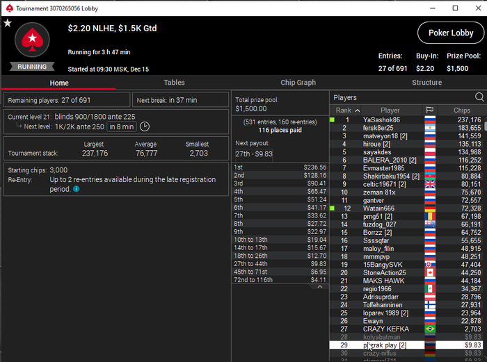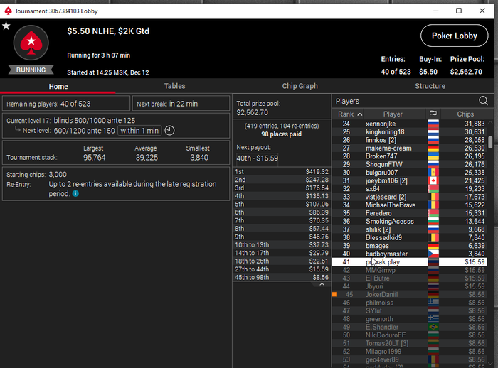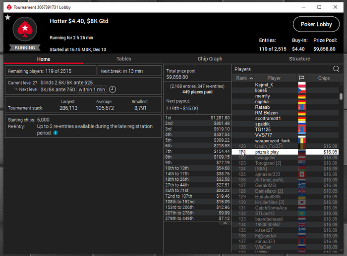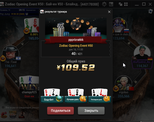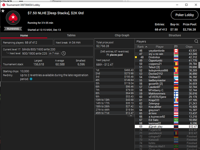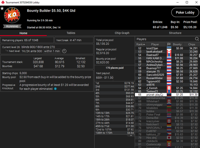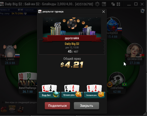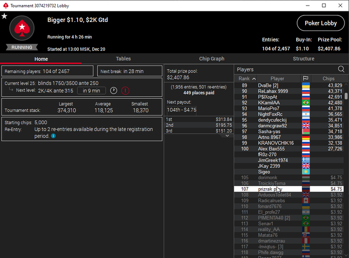 Единственное что меня немного успокаивает и возможно это и есть мастерство игры, что за 13 минусовых сессий у меня получилось не так много проиграть при условии что обычная моя сессия примерно 140-170$ загрузки. Сегодня было 3 очень крутых прохода в дипе за 7.5, билдере за 3.3 и дейли дипе за 5.5, в итоге во всех меня переехали снизу, кроме одного где я на огромных стек проиграл монету с АКs в JJ. Короче сессия -4$. Бр 4919$. Скорее всего возьму день два отдыха от игры и стримов, чтобы морально восстановиться. После дня 110 скину график марафона. Желаю всем заносов и минимального количества переездов!!!