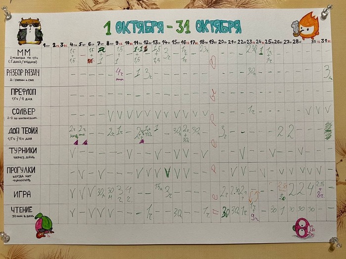 Вообще изначально план был мало катать и дофигища заниматься теорией. Но в реальности получилось, что катал действительно мало, да и теорией занимался не то, чтоб прям дофига. Маленькая даже сделала ещё один план-плакат на месяц, который по сравнению с тем даже стыдно показывать (в плане плакат-то огонь, а вот заполнен он ну совсем не полностью).