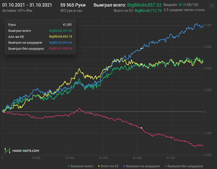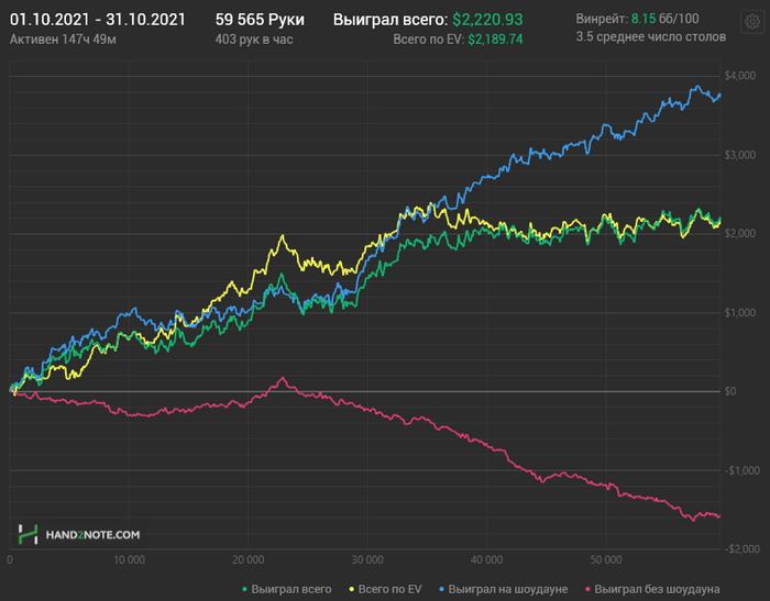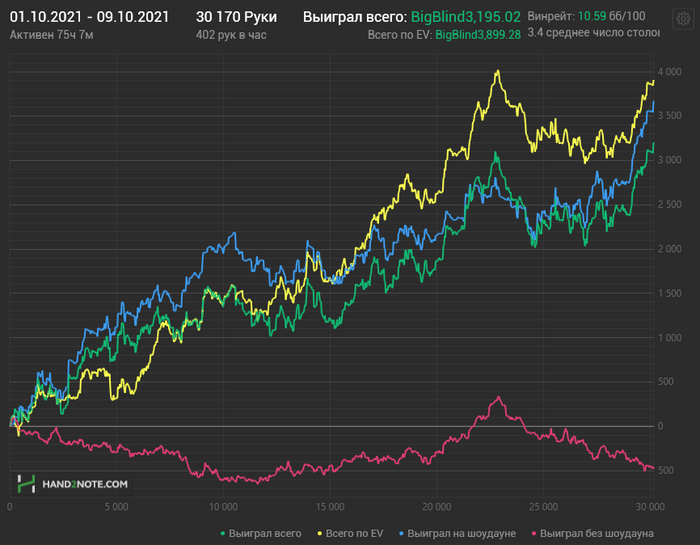 В целом по суммарному доходу получился очень хороший месяц, по ев даже на одном уровне с топовым августом. Но месяц можно разделить на 2 половины: до отпуска, когда хорошо заходило и плюсовал, и после, когда была игра в ноль. На графике этот перелом очень хорошо виден в районе 32к рук. Этот период игры в ноль продолжается и на данный момент.