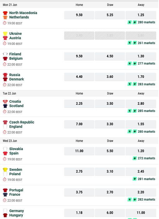 Интересно, что перед стартом второго тура считала небольшим фаворитом встречи Украину — на нее давали коэффициент 2.54, на победу Австрии 2.94, а на ничью 3.43. Но за минувшие сутки котировки изменились — коэффициент на ничью рухнул до 1.99 , а победы Украины (3.65) и Австрии (3.65) стали оцениваться заметно выше.